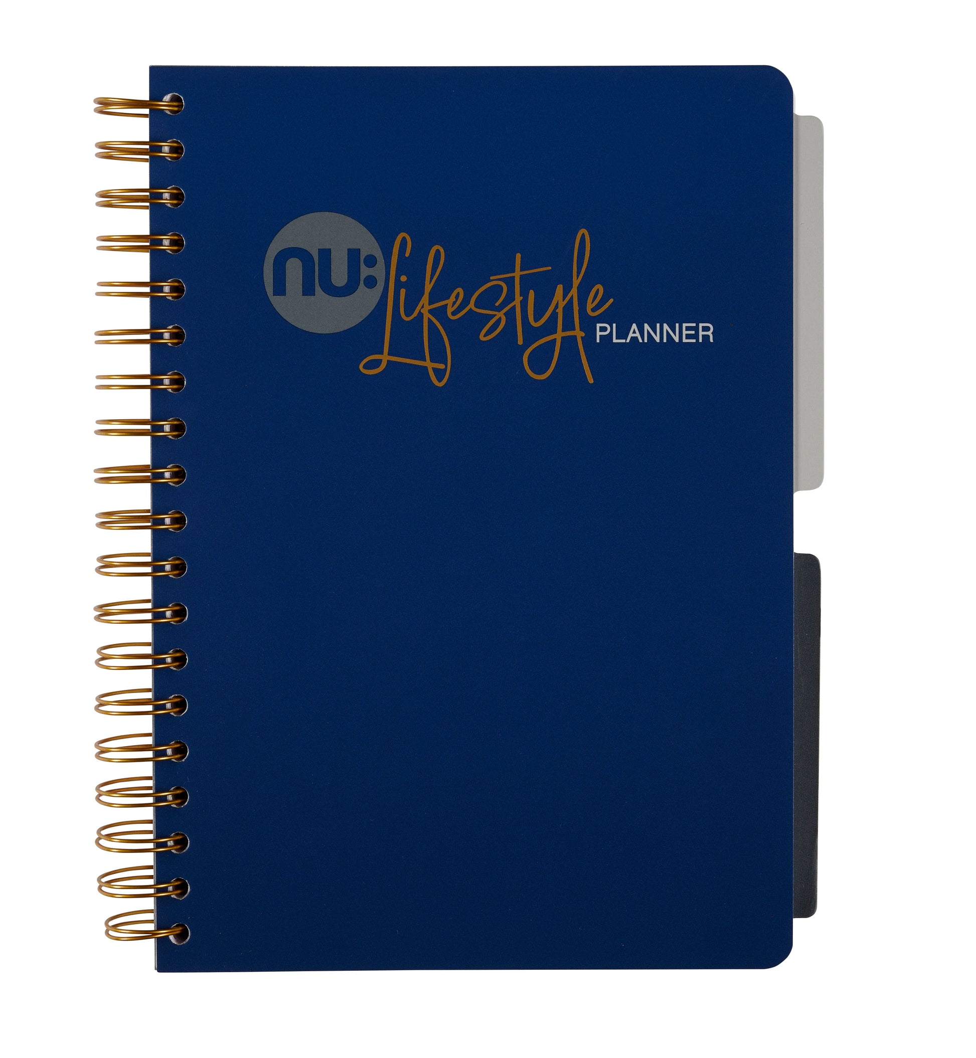 The nu: Navy B5 Lifestyle planner features soft touch covers with gold foil detailing and a matching gold wiro. Inside the book there are two sections, section one: budget and exercise trackers, water intakes and daily notes section. Section two: things to do checklist and full ruled pages for note taking.