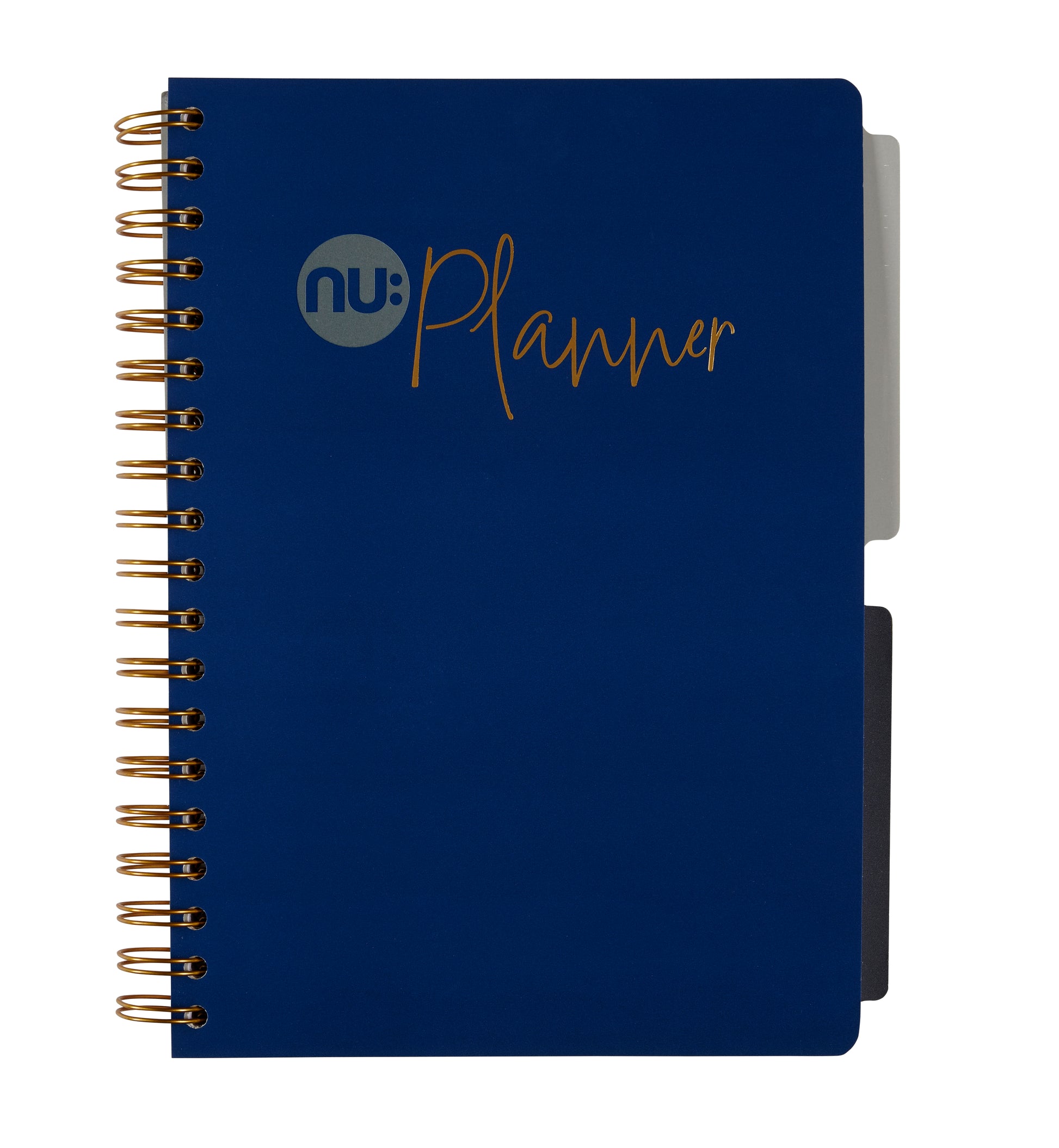 The nu: Navy B5 planner features soft touch covers with gold foil detailing and a matching gold wiro. Inside the book there are two sections, section one: weekly timetable main aims and deadlines, thoughts and goals for the following week then in section two: tear out index cards with a pocket to keep your cards in the back of the book.
