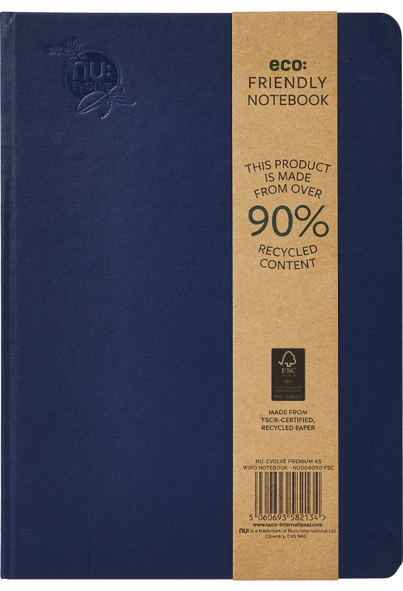 The Nu: Evolve Premium Casebound Notebook is made from over 90% recycled content including high quality FSC® Certified paper. The soft touch covers are made from 30% post consumer recycled waste and feature an debossed logo detailing. This product has 120 pages of ruled 90gsm paper printed with vegetable based inks with rounded corners.